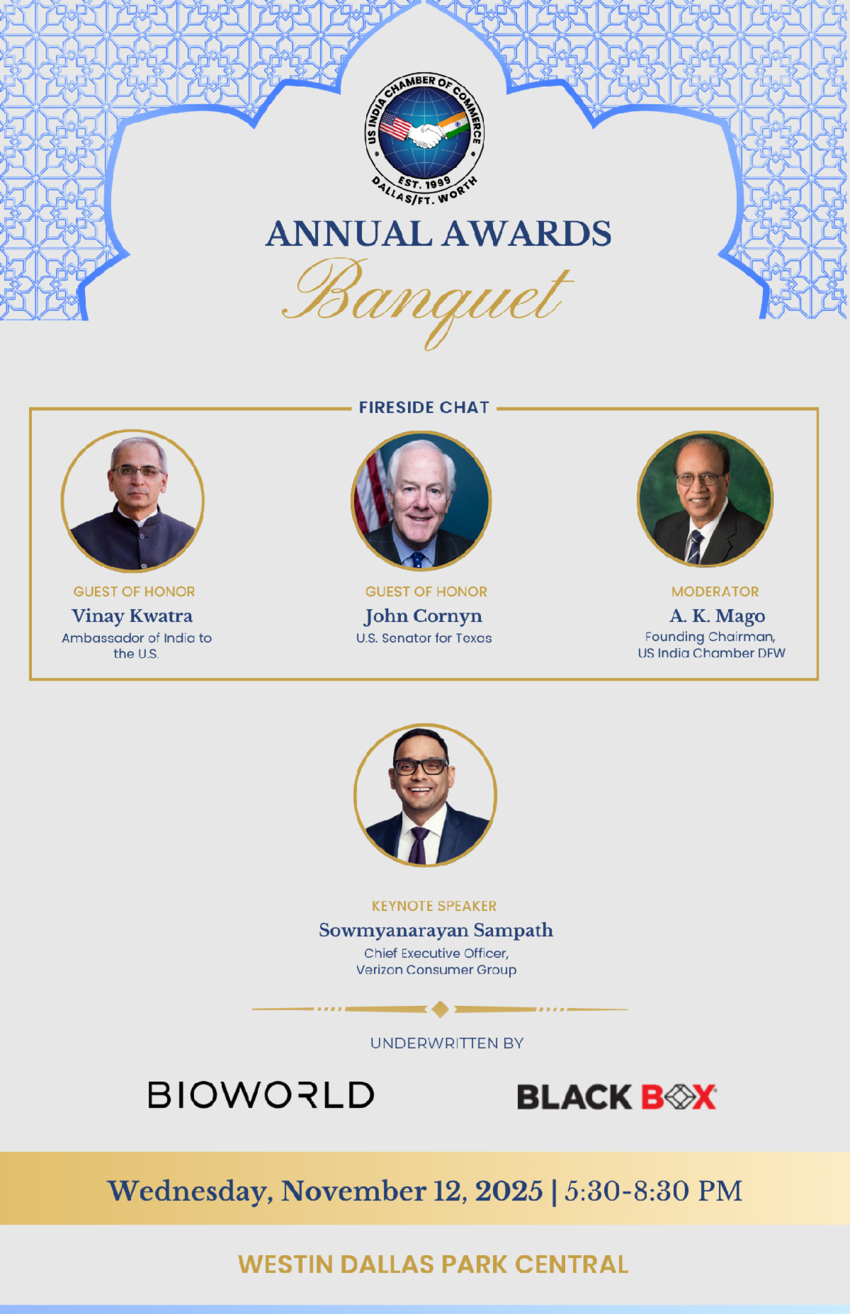 The US India Chamber DFW is now accepting nominations to honor the leaders, entrepreneurs, and organizations who inspire us with their vision and impact. Share their story, celebrate their achievements, and help us shine a light on those making a difference.